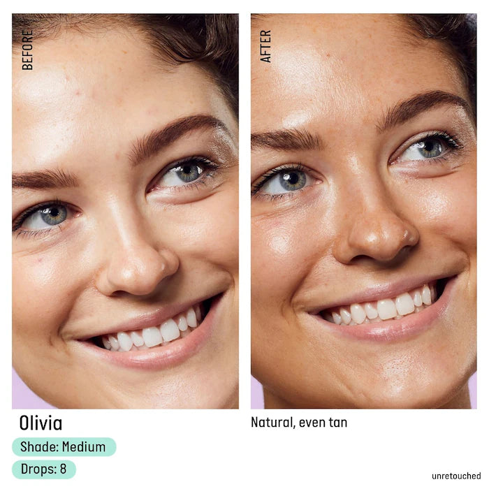 La fórmula liviana, limpia y concentrada se mezcla fácilmente con su humectante o suero para obtener un acabado naturalmente bronceado, sin rayas y duradero en una sola aplicación. Para una base de piel impecable, también puedes mezclar gotas con tu base favorita. Los activos correctores del color minimizan la apariencia de enrojecimiento e hiperpigmentación mientras unifican todos los tonos de piel para un bronceado que dura hasta cinco días.